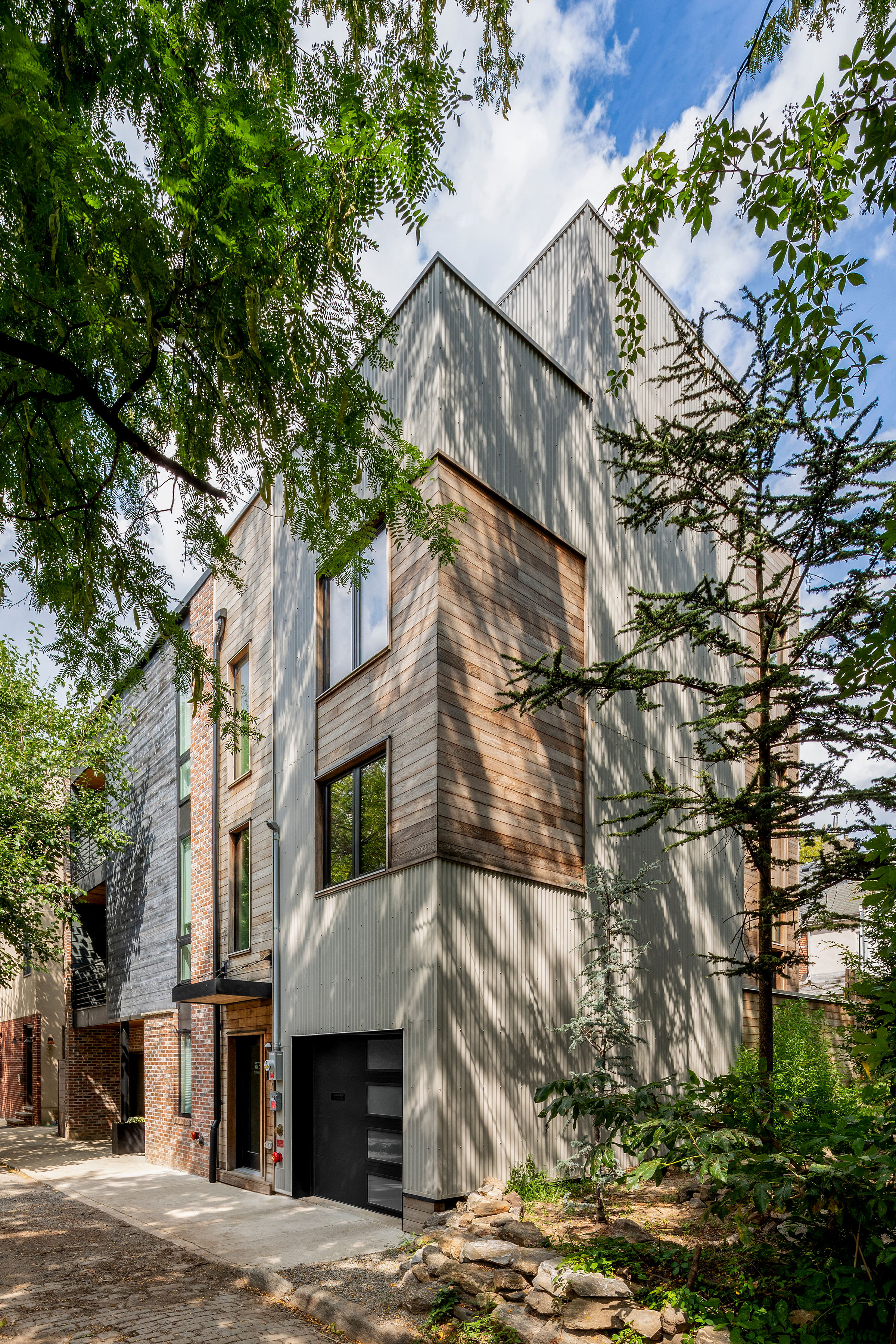 With this time, the design team made the decision to set back a portion of the building from the property line. While sacrificing potential interior living space on an already tiny lot, it extends the visual connection to the park and allows for a small terrace. The design decision also mitigates the typical solid ‘party wall’ condition common in Philadelphia row homes. Lauren Thomsen Design took this opportunity to experiment with building materials and paired corrugated metal with locally sourced thermally modified tongue and groove oak siding.