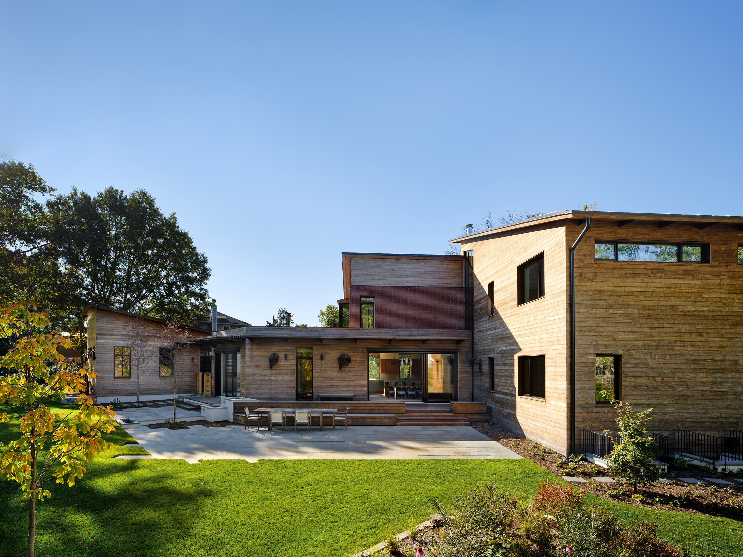 The half-acre site had an irregular shape, cobbled together from three lots. After demolishing the existing structures, Buelow took into consideration that while her clients wanted a spacious home, they also wanted it to blend with the character of their Del Ray neighborhood in Alexandria. Buelow had the front of the house built out of brick made in North Carolina from recycled ceramic materials. For the rest of the exterior, she used Kebony wood, a sustainable, eco-treated pine that starts brown but weathers to a silvery gray.