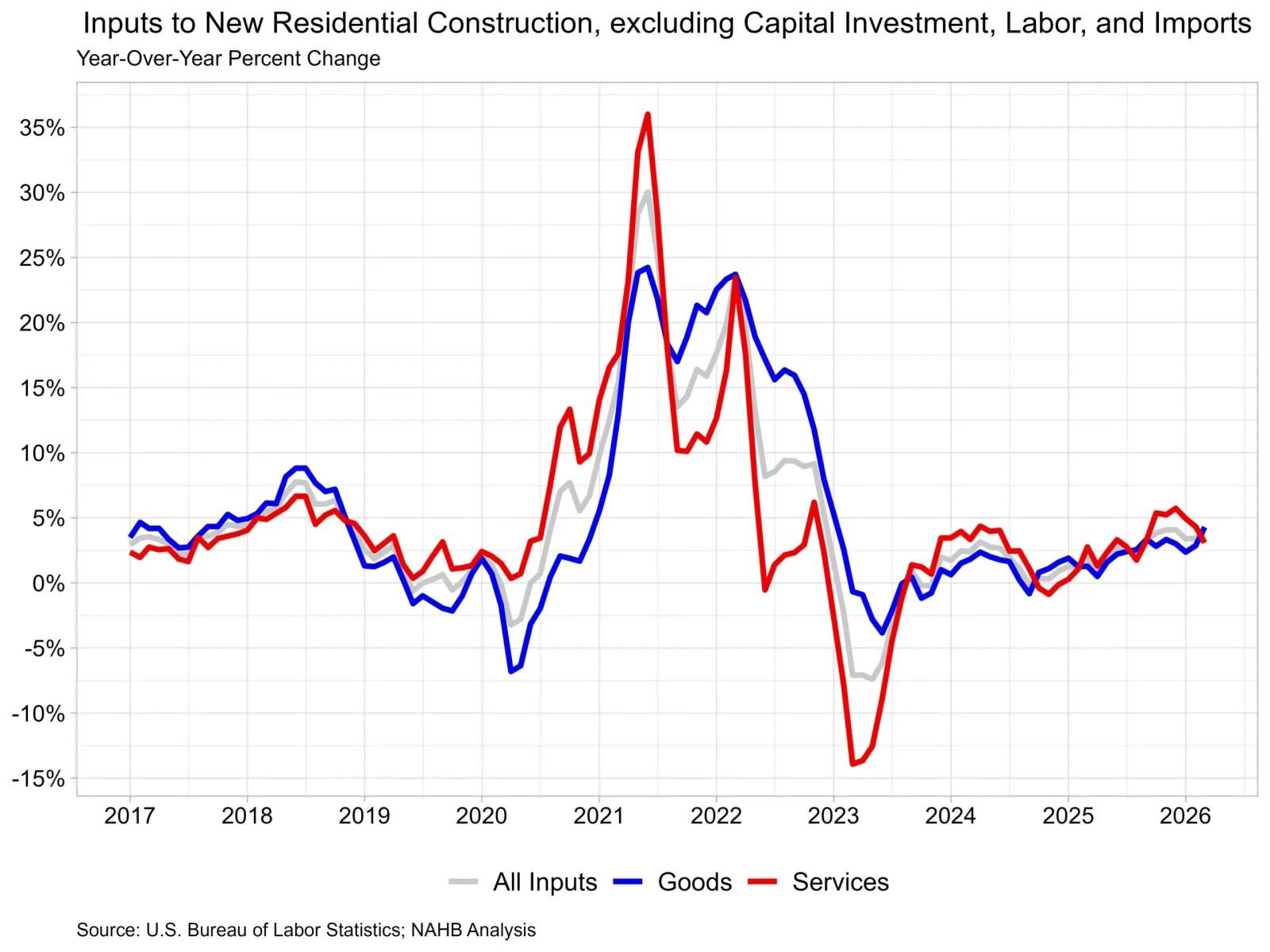 The price index for inputs to new residential construction rose 1.2% in March and was up 3.8% from 2025. The price of goods used in new residential construction was up 1.8% over the month and up 4.3% from last year, while the price of services was up 0.3% over the month and up 3.1% from last year.